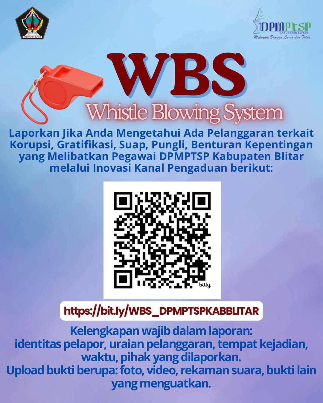 Jika Anda mengetahui ada pelanggaran atau penyimpangan terkait hal-hal tersebut yang melibatkan Pegawai DPMPTSP Kabupaten Blitar Laporkan! Jaminan Kerahasiaan Pelapor 👌🏻