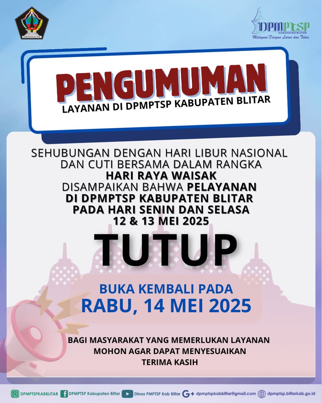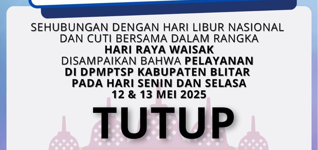 Sehubungan dengan hari libur nasional dan cuti bersama dalam rangka Hari Raya Waisak 2569 BE disampaikan bahwa pelayanan di DPMPTSP Kabupaten Blitar pada :