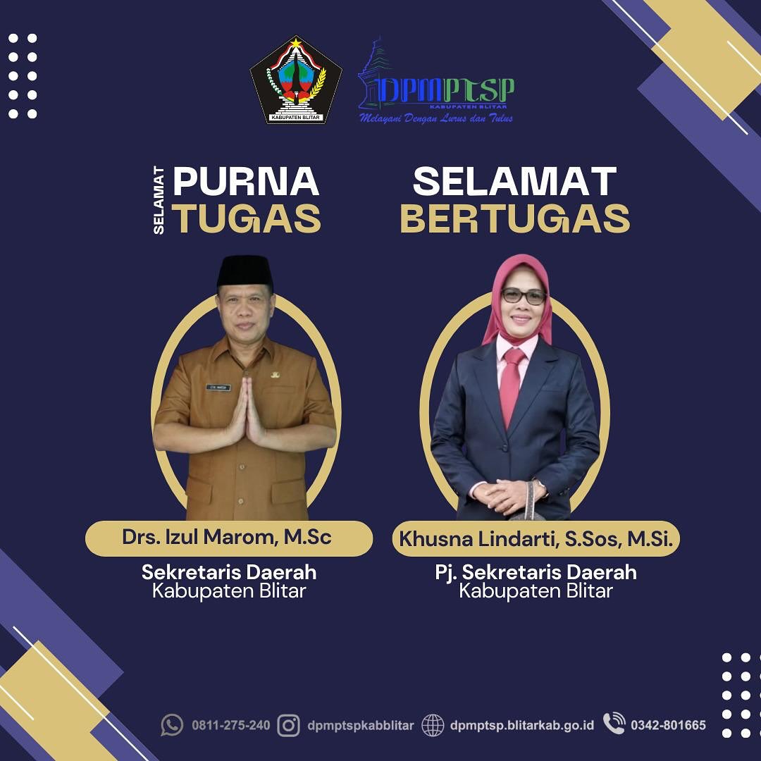 DPMPTSP Kabupaten Blitar mengucapkan selamat memasuki purna tugas kepada Bapak Drs. Izul Marom, M.Sc Semoga semua dedikasi dan karya selama menjabat sebagai Sekretaris Daerah Kab. Blitar menjadi amalan ibadah, Dan semoga senantiasa diberi kesehatan, keselamatan serta dalam perlindungan Allah SWT.