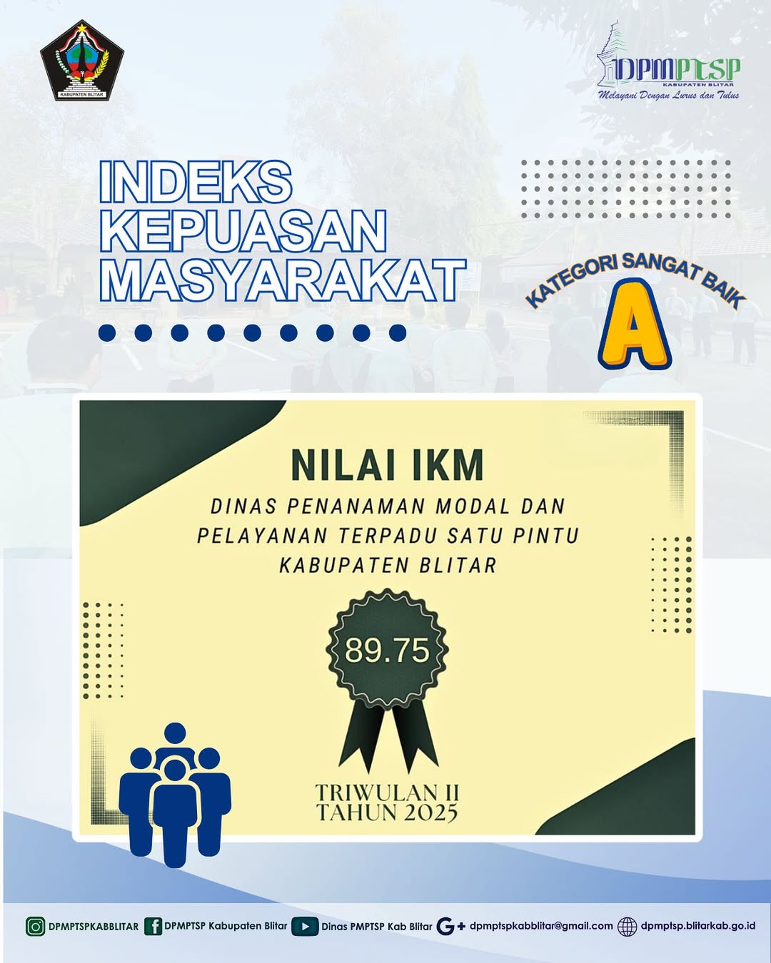 Periode Triwulan II 2025 (April-Juni) Nilai IKM (Indeks Kepuasan Masyarakat ) DPMPTSP Kab. Blitar adalah 89,75 tidak sebesar nilai IKM pada triwulan I tetapi masih pada mutu pelayanan A masuk kategori sangat baik).