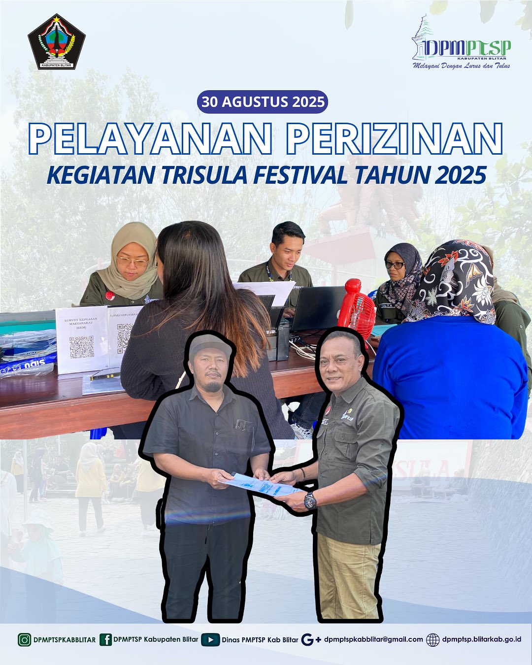 Pada tanggal 30 Agustus 2025 DPMPTSP Kabuaten Blitar berpartisipasi memberikan fasilitasi pelayanan perizinan baik penerbitan izin usaha maupun konsultasi perizinan dalam kegiatan Trisula Festival Tahun 2025 di Monumen Trisula, Kecamatan Bakung.