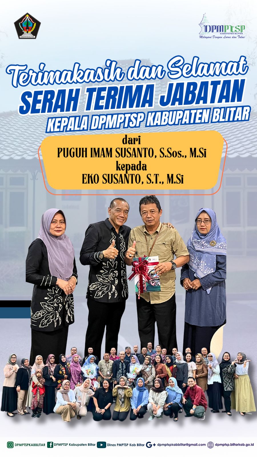 Pada 1 September 2025 silam, DPMPTSP Kabupaten Blitar melaksanakan serah terima jabatan Kepala Dinas Penanaman Modal dan Pelayanan Terpadu Satu Pintu Kabupaten Blitar dari Puguh Imam Susanto, S.Sos., M.Si kepada Eko Susanto, S.T., M.Si.