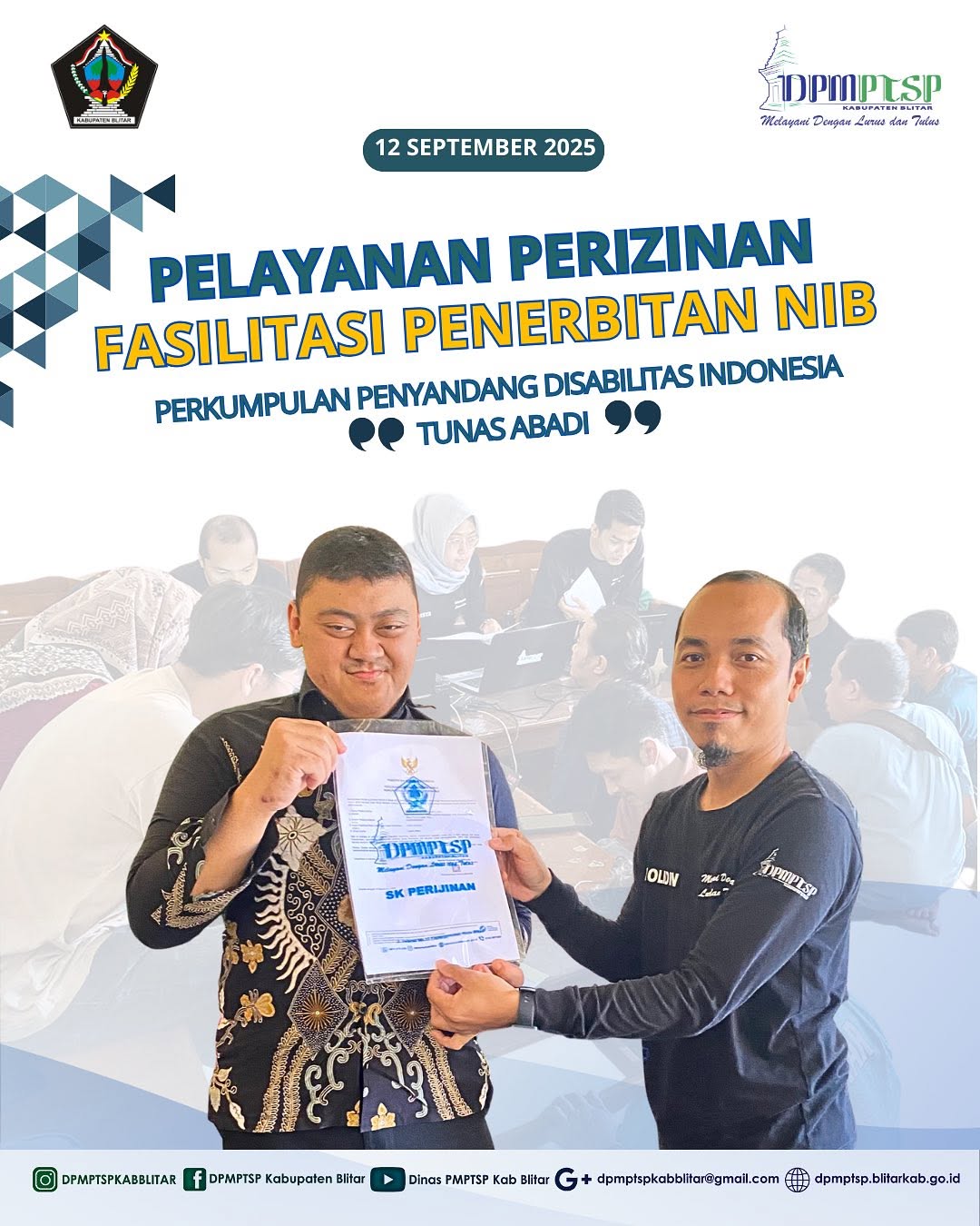 Kemarin Hari Jumat, 12 September 2025 DPMPTSP Kab Blitar melaksanakan pelayanan perizinan jemput bola dengan memfasilitasi penerbitan NIB kepada teman-teman penyandang disabilitas untuk legalitas usahanya.