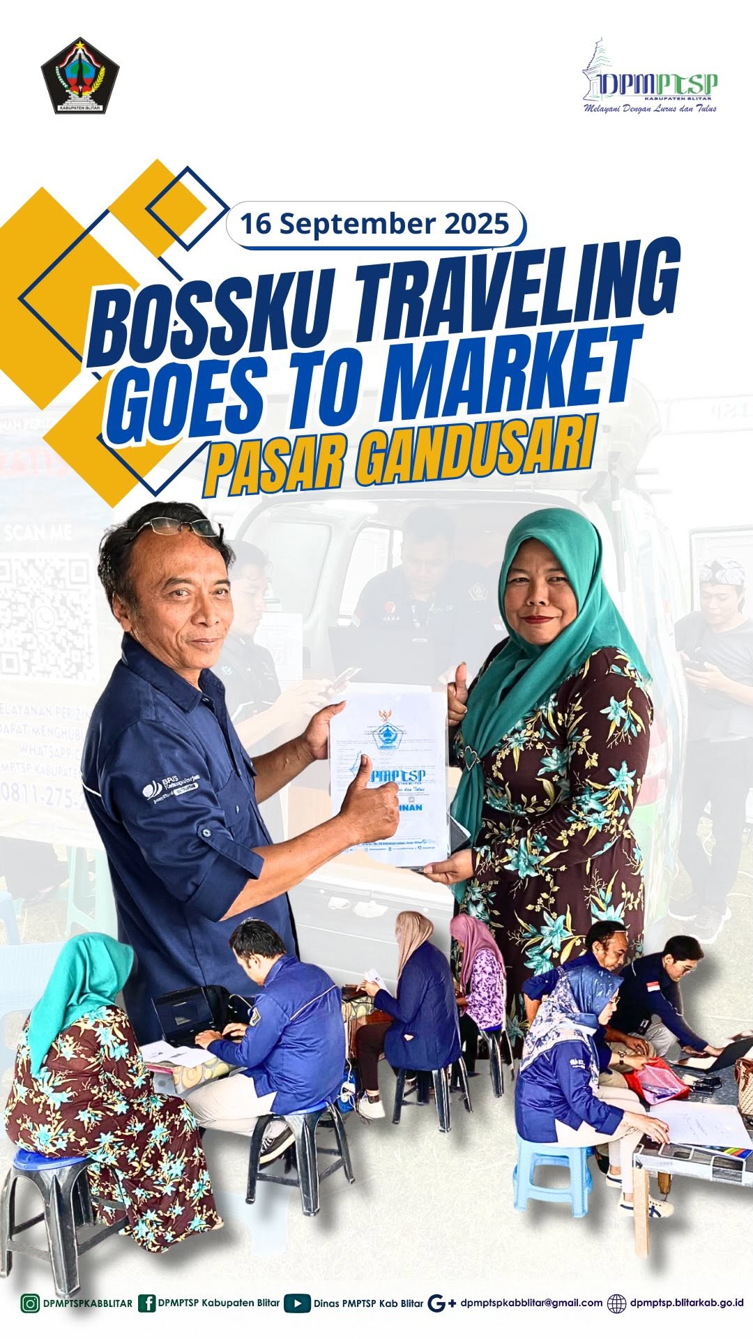 Hari ini 16 September 2025 Tim Pelayanan DPMPTSP Kab Blitar melaksanakan pelayanan jemput bola BOSSKU Traveling Goes To Market di Pasar Gandusari. Jumlah pemohon izin yang terlayani berjumlah 20 orang.