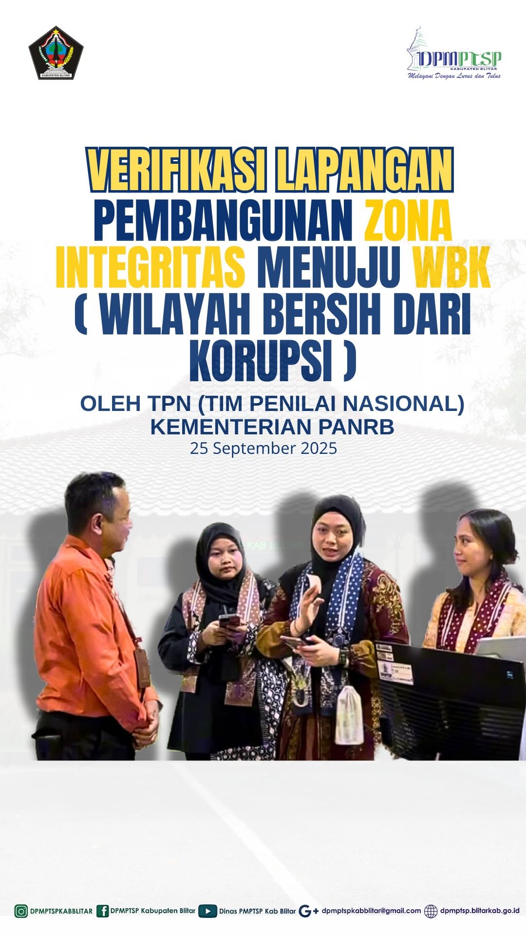 Kamis, 25 Sep 2025 DPMPTSP Kab. Blitar menerima kunjungan Tim Penilai Nasional (TPN) dari Kementerian PANRB dalam rangka verifikasi lapangan pembangunan Zona Integritas menuju Wilayah Bebas dari Korupsi (WBK) dan Wilayah Birokrasi Bersih dan Melayani (WBBM).