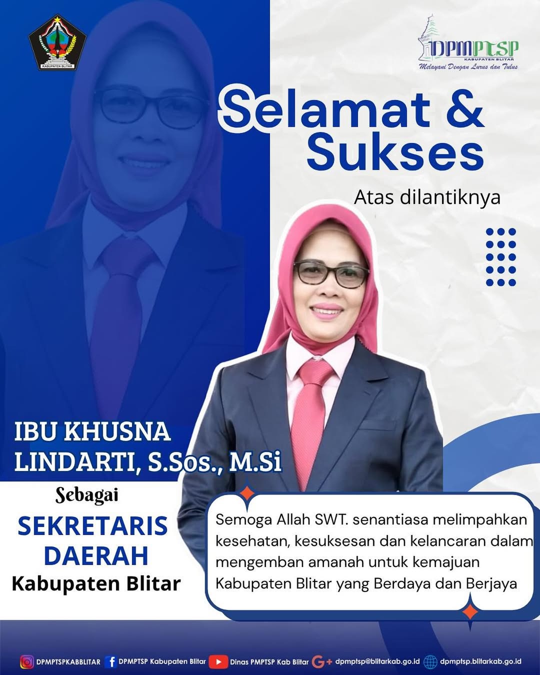 DPMPTSP Kabupaten Blitar mengucapkan Selamat atas dilantiknya Ibu Khusna Lindarti, S.Sos., M.Si sebagai Sekretaris Daerah Kabupaten Blitar, Semoga selalu di berikan kelancaran dan Kesehatan dalam mengemban Amanah serta mengabdi di Kabupaten Blitar.