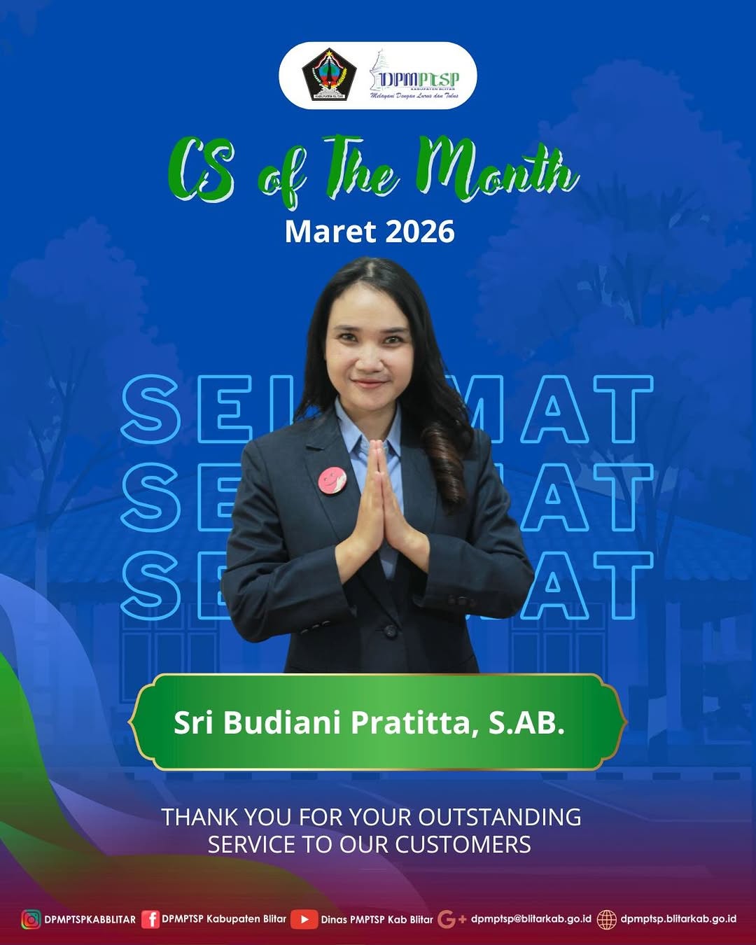 Selamat dan sukses kak Tita atas penghargaan sebagai CS Of The Month DPMPTSP Kabupaten Blitar, periode Maret 2026.
